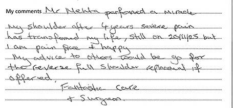 To all the staff and team involved in orthopaedics and thank you for your efficiency to all correspondence. I am thanking you so much for all the treatments I have received for my shoulder replacement operation. Also thank you so much Mr. Mehta for the wonderful work you have done on my shoulder. Your kindness and concern of all procedures involved in the operation and afterwards your success and expertise achieved is marvellous.
