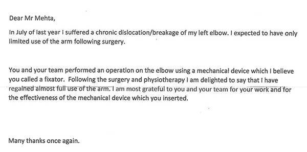 I had a really good experience from start to finish. Mr Mehta explained everything to me in detail which made me feel at ease. Both myself and Mr Mehta did have a conversation beforehand about the operation and were not sure if the operation would have an difference on my elbow. However, Mr Mehta worked his magic and I now have a very good range of movement in my elbow and this has improved my quality of life. I am now able to undertake tasks that I was not able to before and I am very pleased with the results.
